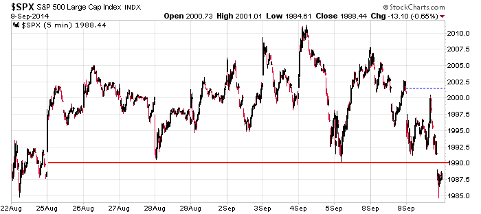 Here’s an update of the S&P intraday chart. The index broke through 10-day support, so I had to back the chart up an extra two days. The move doesn’t guarantee anything, but it does increase the odds the market breaks out from its recent funk. Penetrating support either induces selling, or it’s a trap – one that will lure more bears to the table before launching upward. Don’t think that’s in the cards? It’s happened a lot. It drops just enough to get active traders stacked on one side, then springs to the other side.