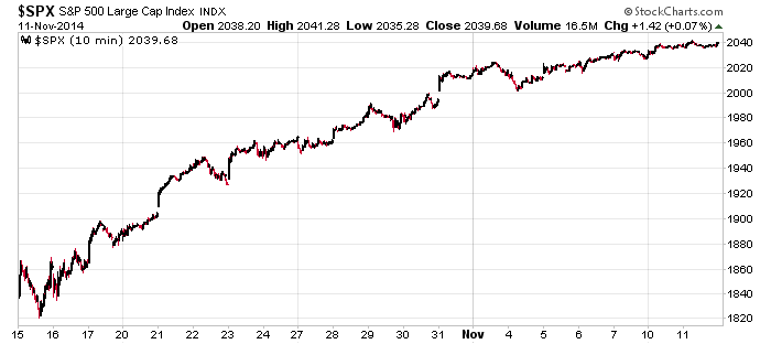 Here’s the S&P over the last 19 days…slow, steady, consistent, methodical. There’s barely a noticeable pullback in there.