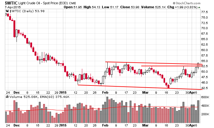 Crude continues to march higher. Yesterday it closed near its highest level since late-December. This despite Saudi Arabia raising its output to 10.3M barrels/day in March, its highest output in 12 years. Here’s the daily chart.