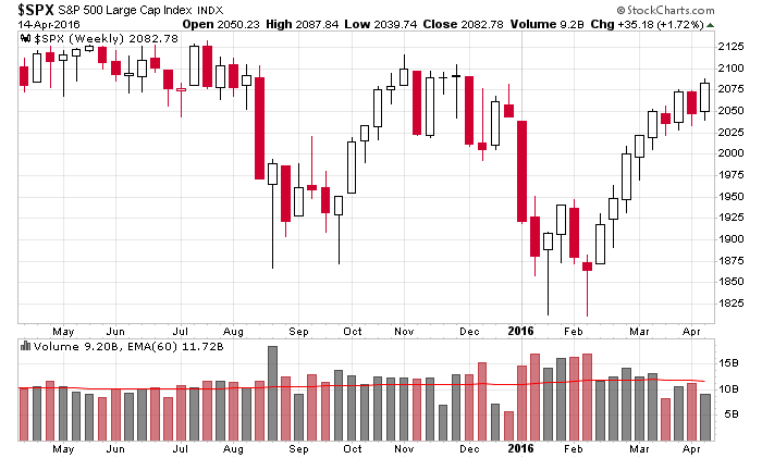 Here’s the S&P weekly. Last week was the biggest down week since the February bottom. This week the entire loss been has recaptured and a higher high made.